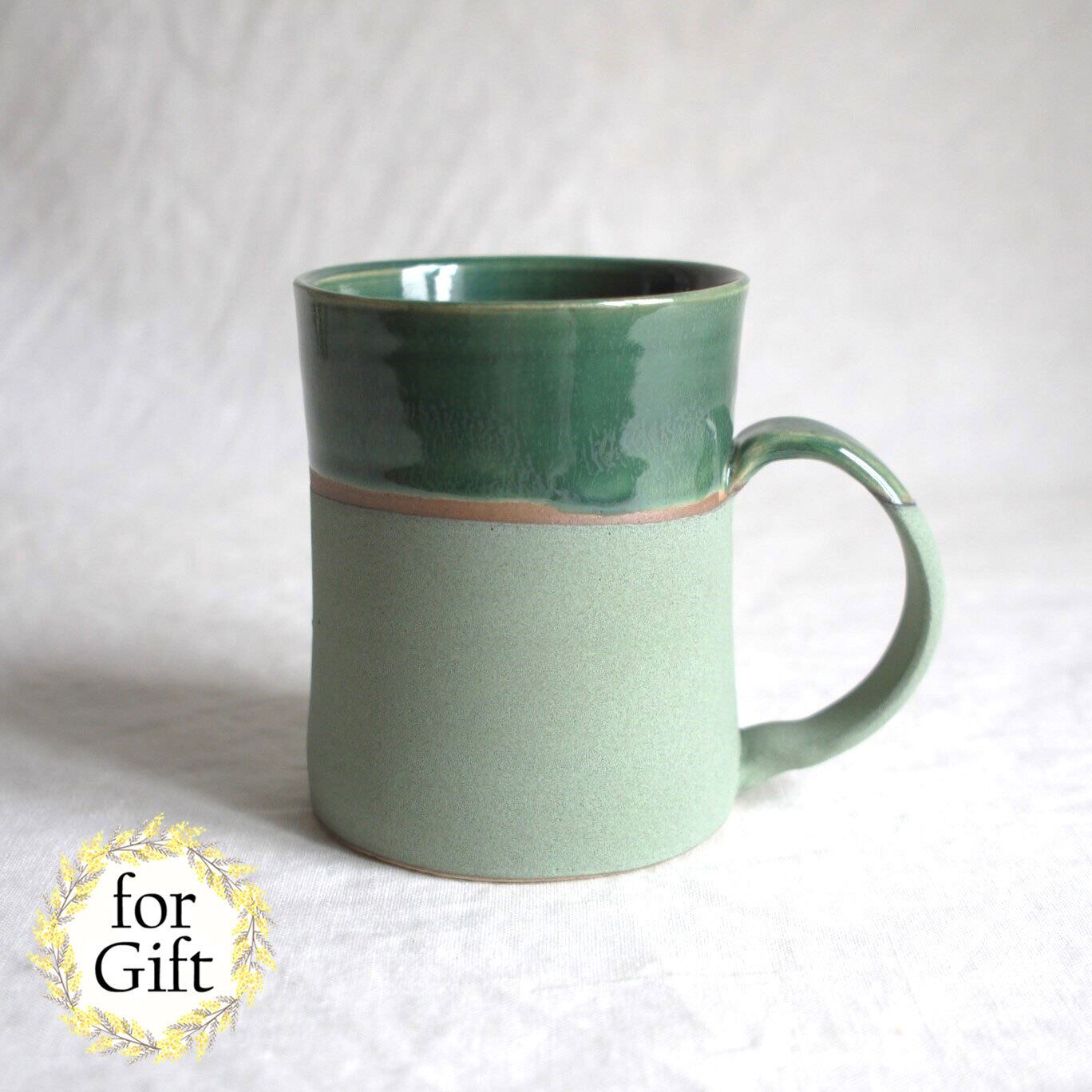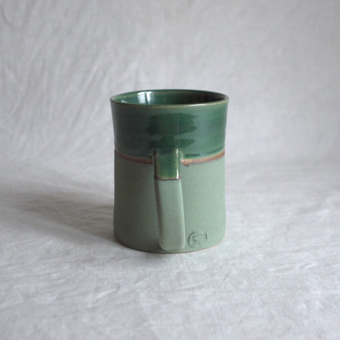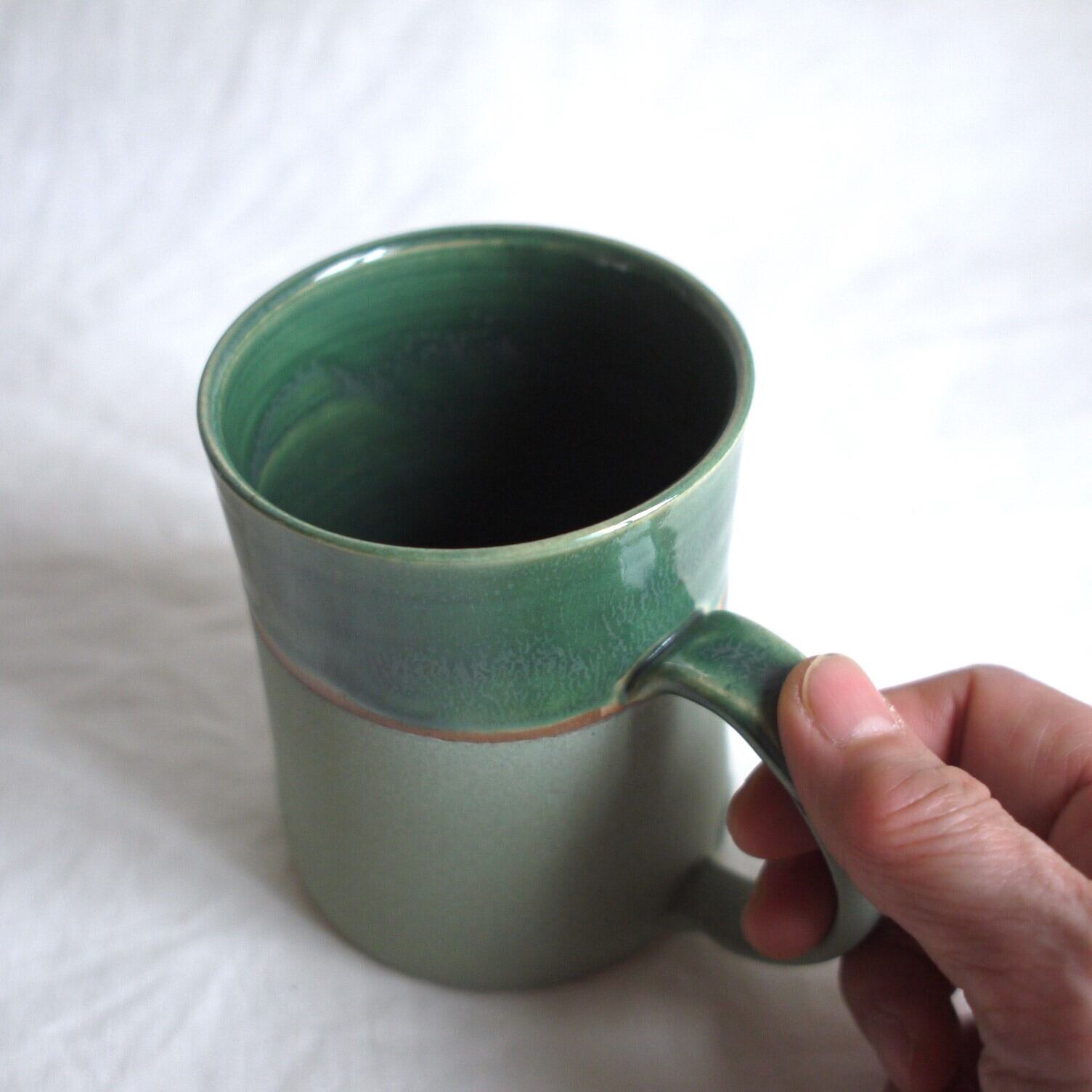 質感の違う二種類のグリーンの釉薬を、上下で掛け分けています。】