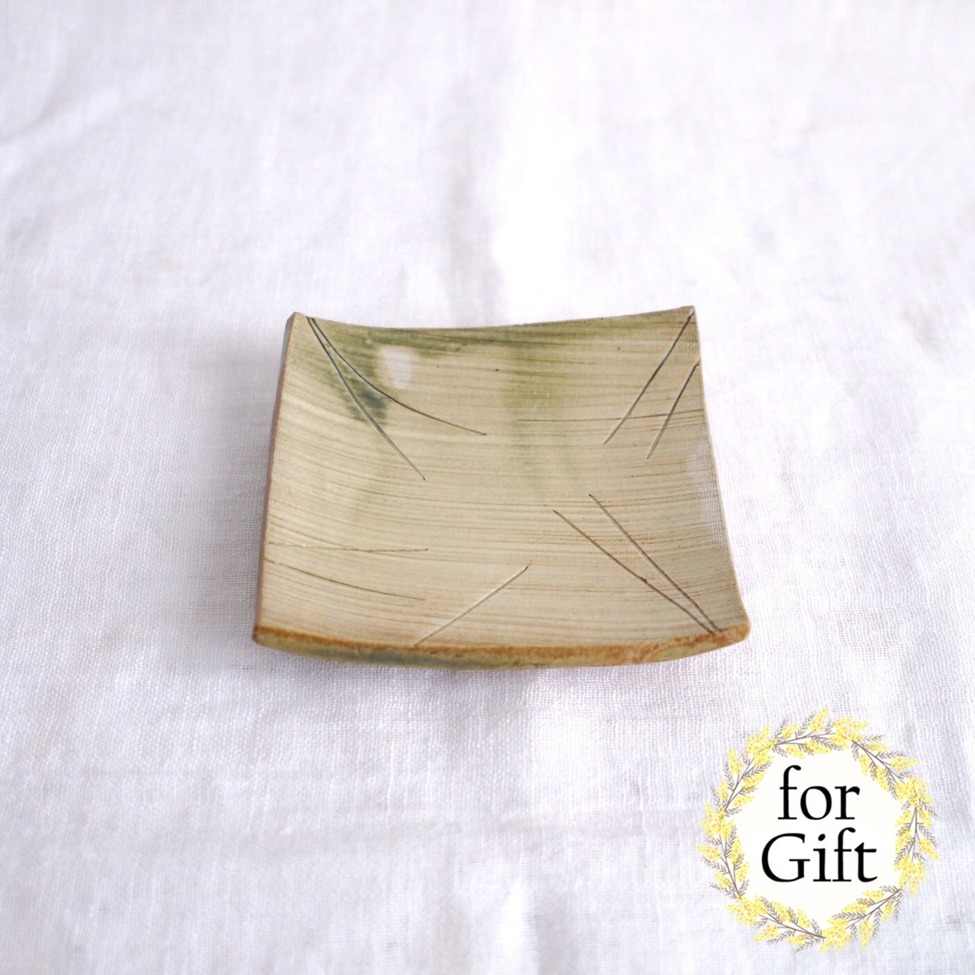 刷毛で白化粧した上に、松の葉で模様を付けたシンプルな小皿。