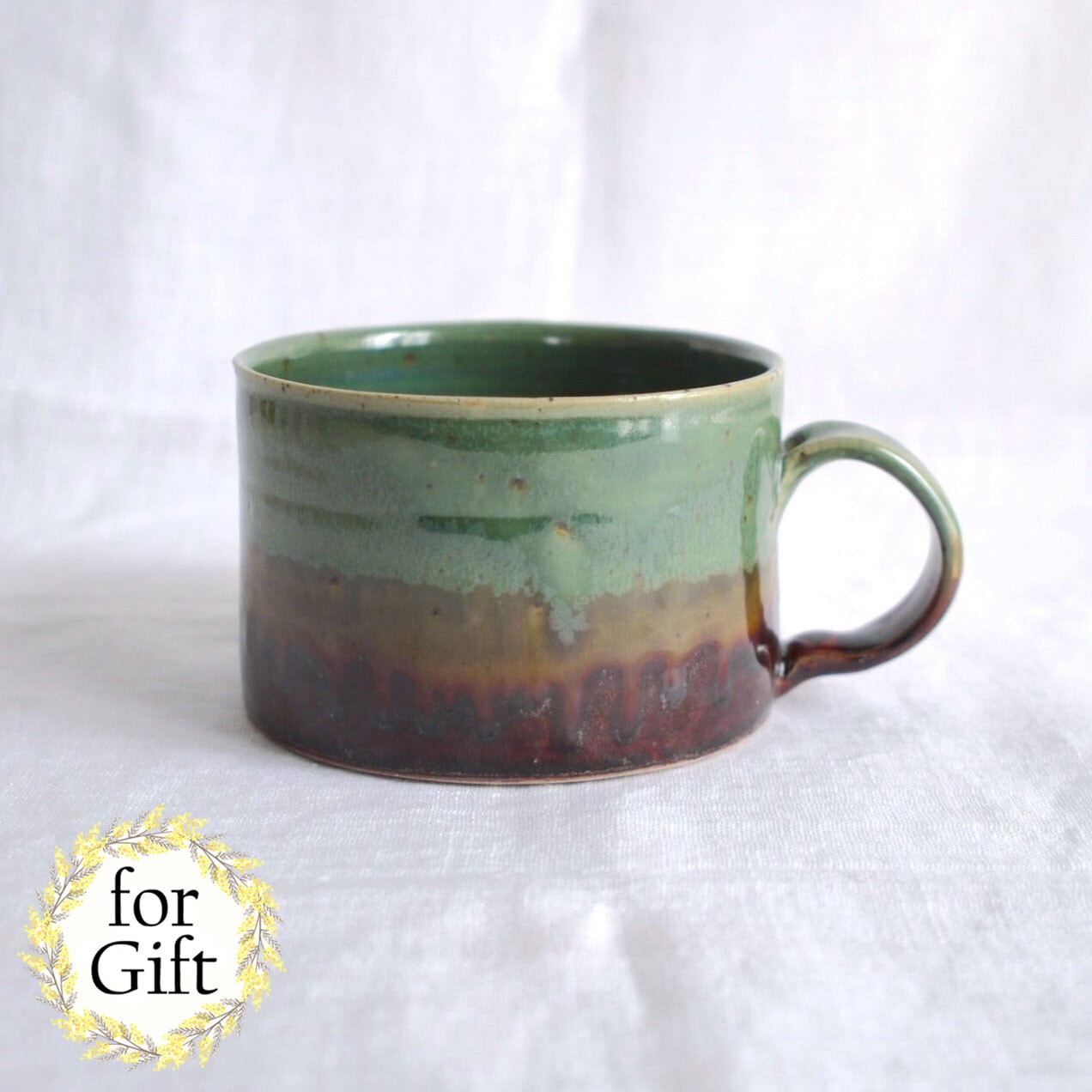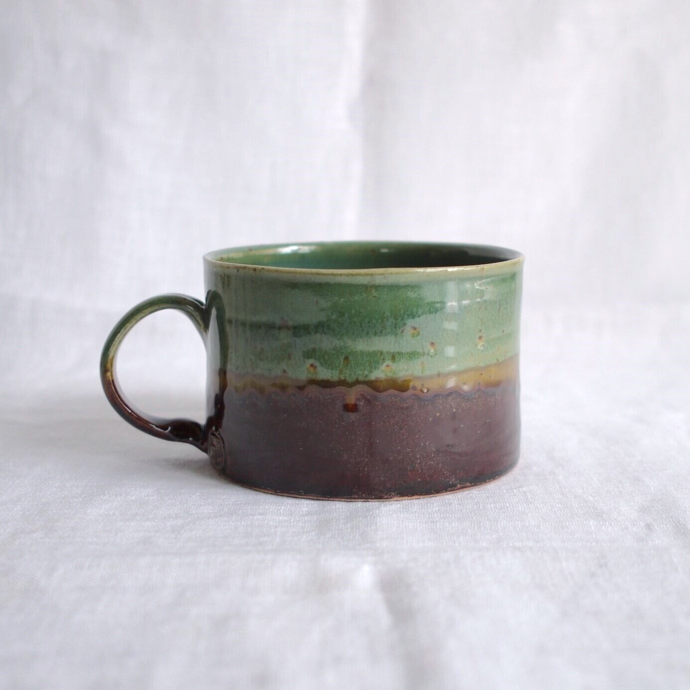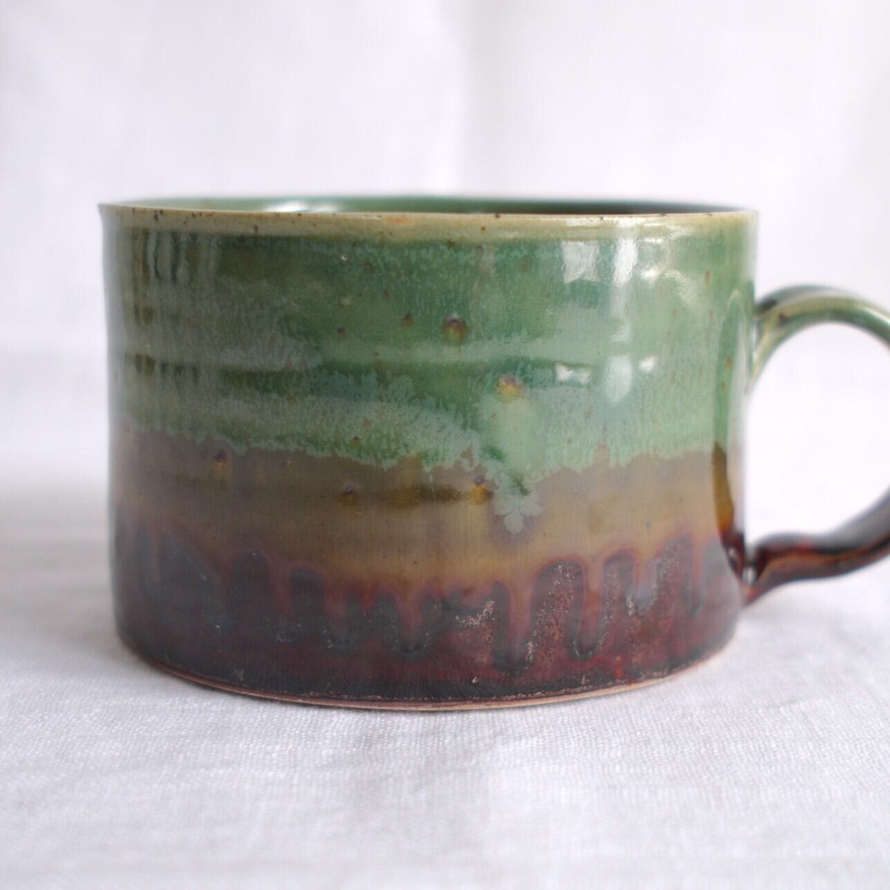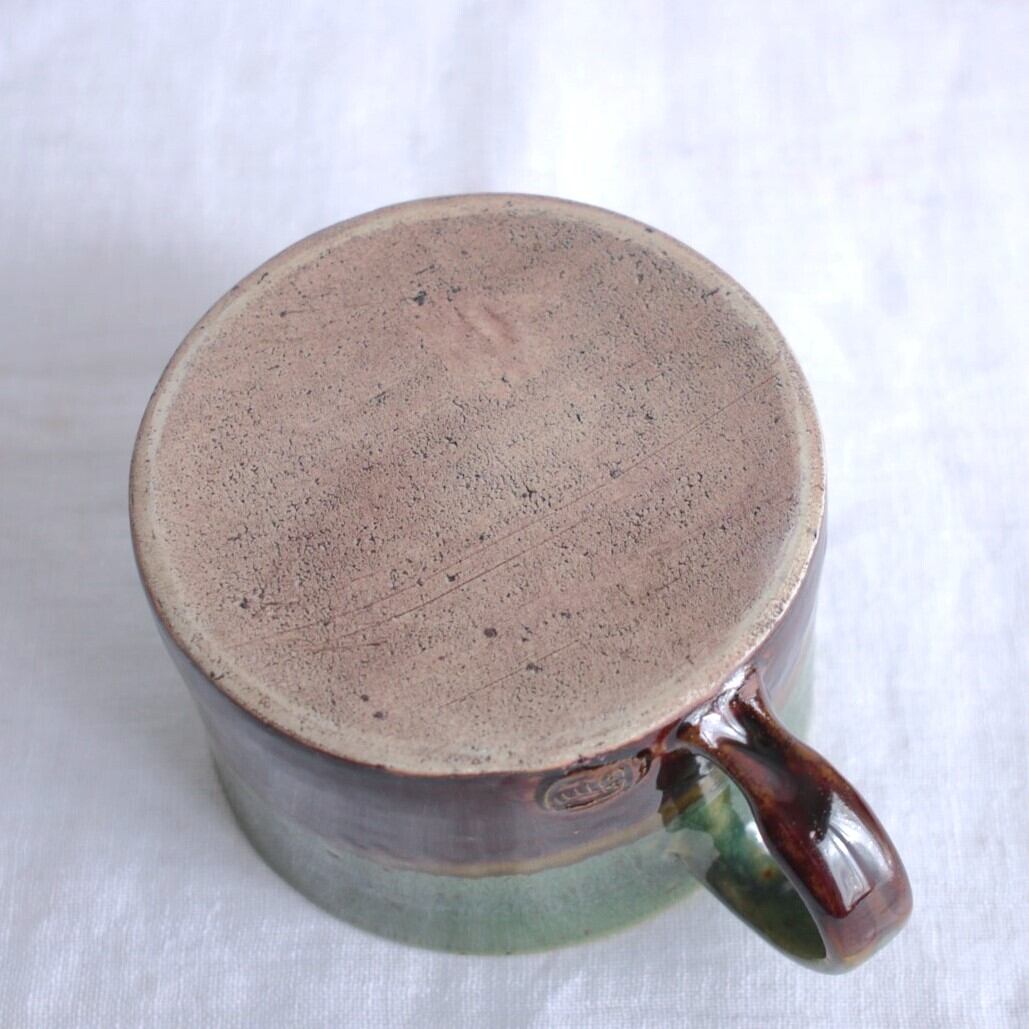 日本三大松原の1つ“虹の松原”をイメージし、深緑とブラウンの釉薬を上下に配しました。中央でふたつの釉薬が混ざり合う景色が見どころです