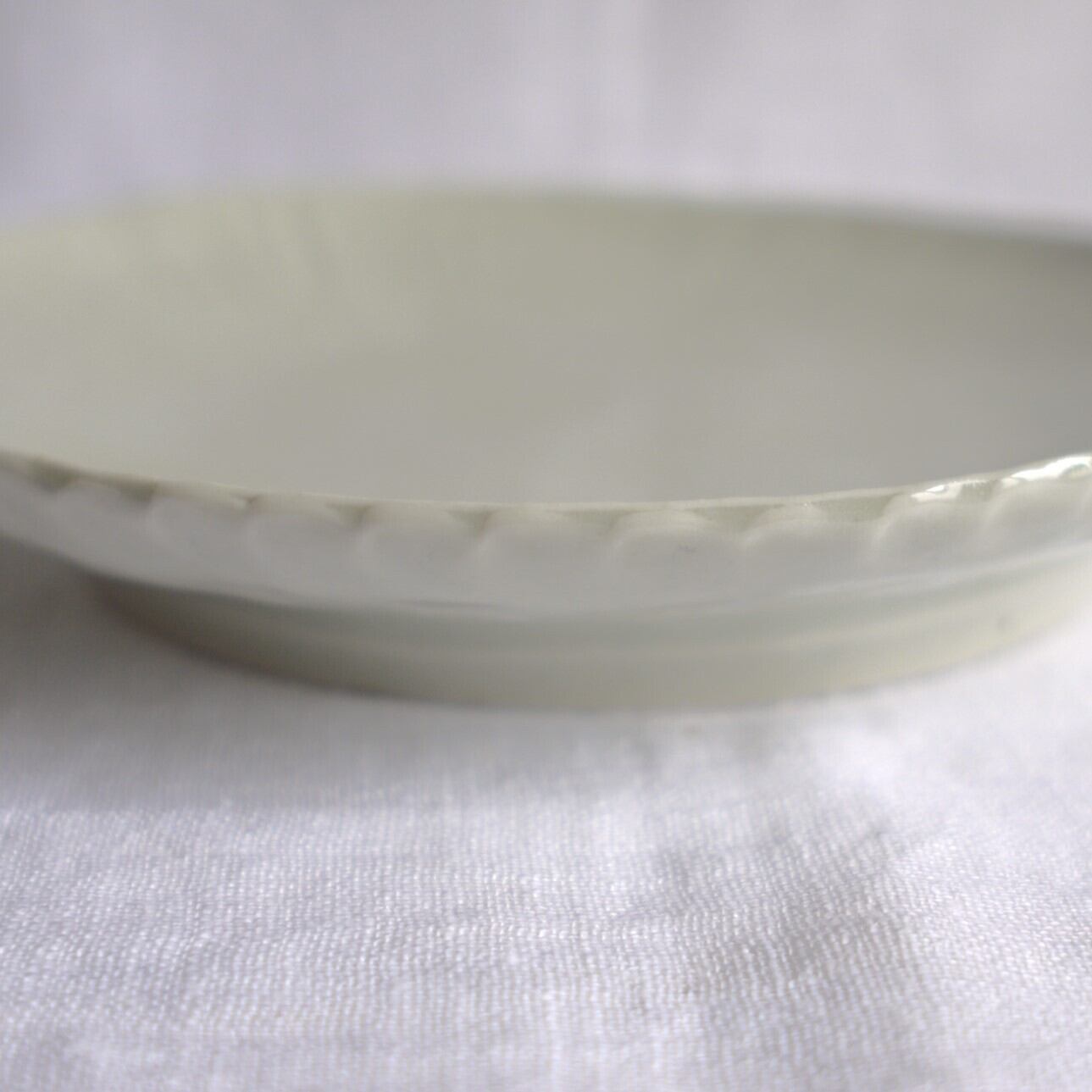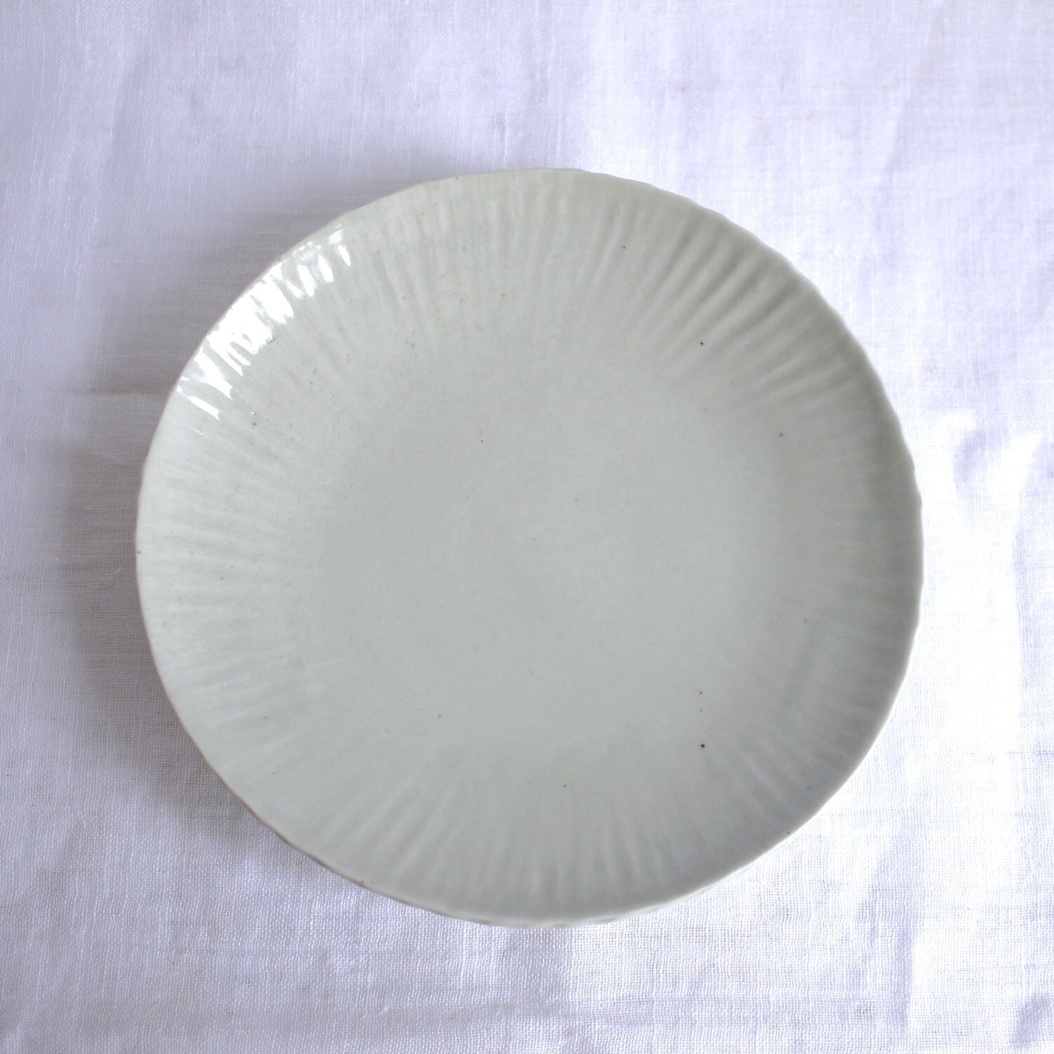 天草の磁器土で制作したお皿。型を使用し、放射状の線模様を入れています。
