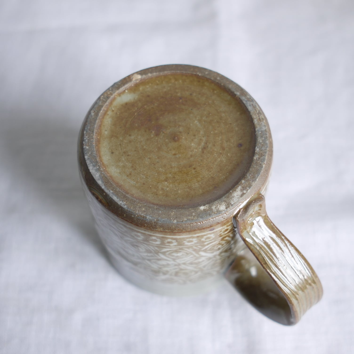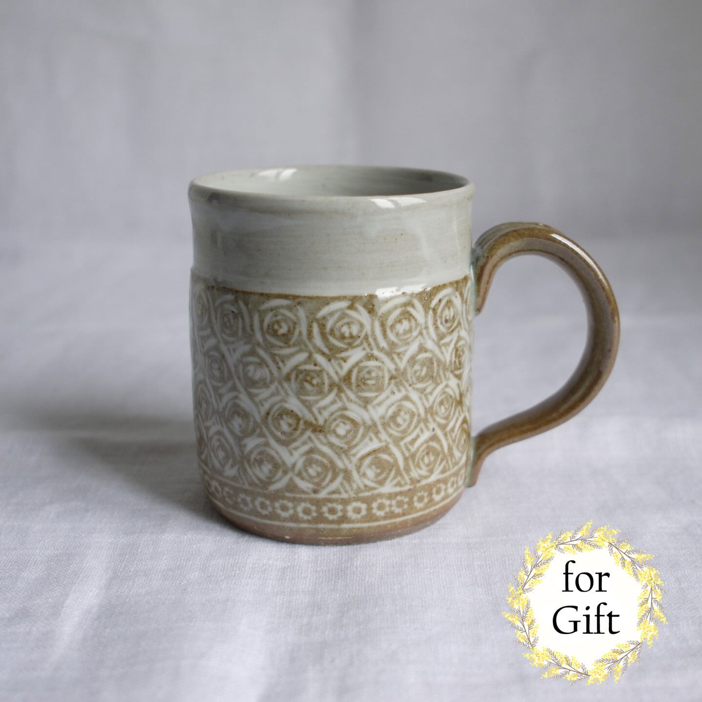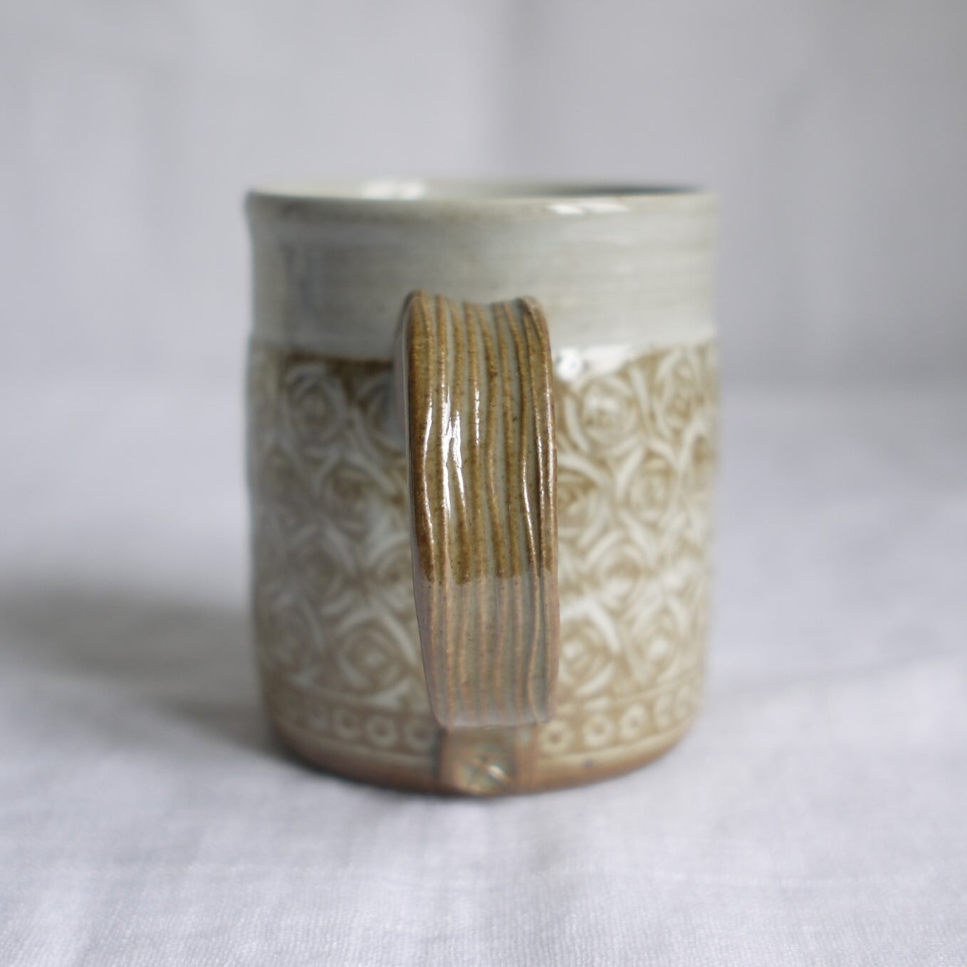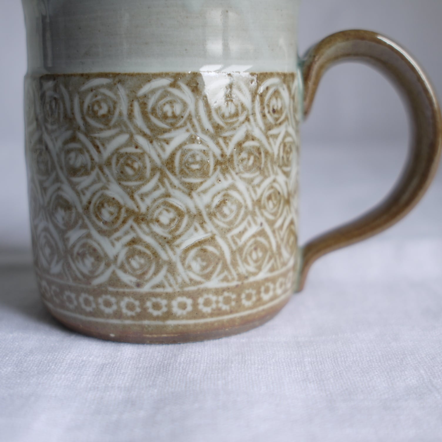 唐津焼の伝統的なスタンプ技法“三島唐津”のマグカップ。全面に印花(スタンプ)と線彫りを施し、そこに白化粧土を塗り詰め、掻き落とします。三島唐津は、唐津焼の中では最も手間暇をかけて作られるものです