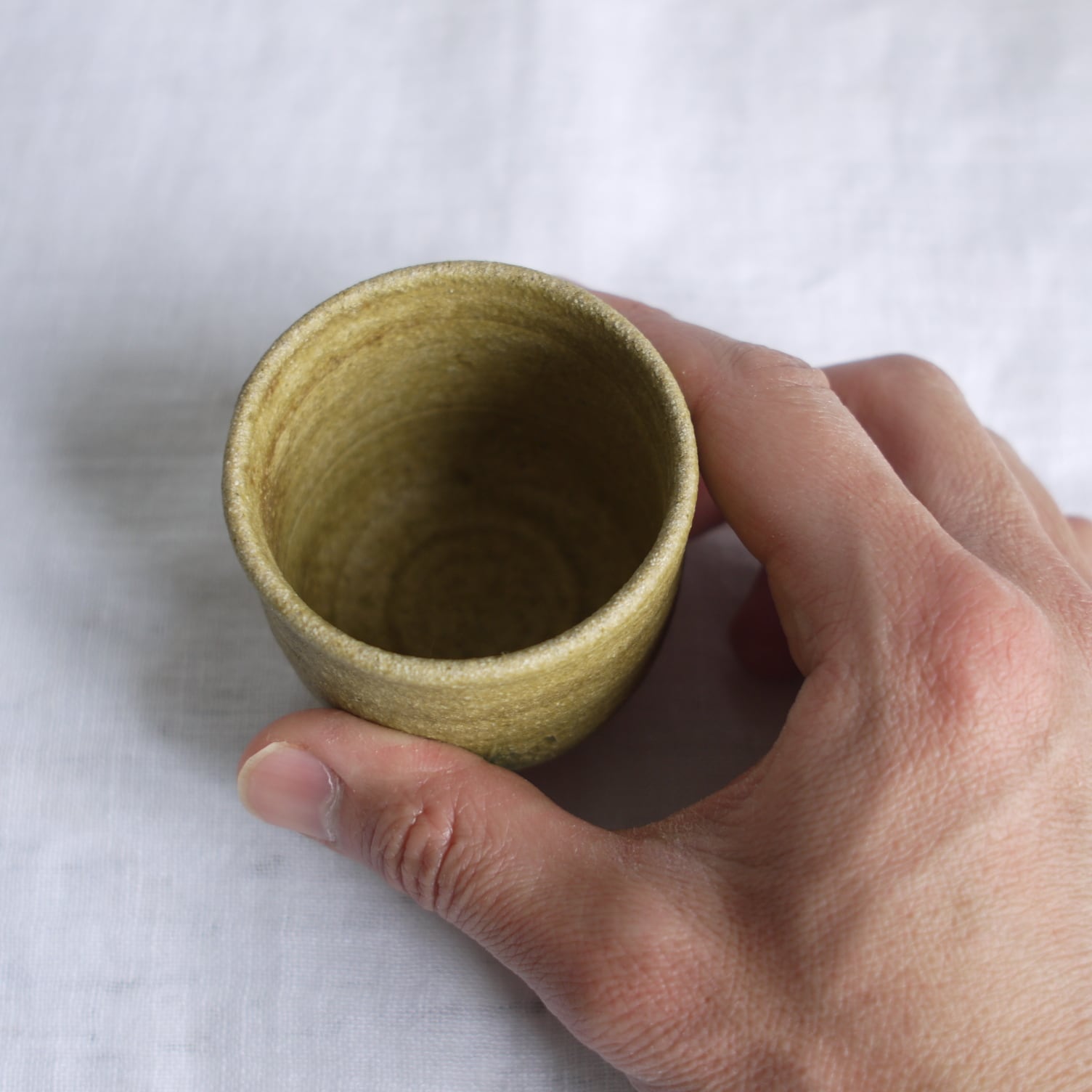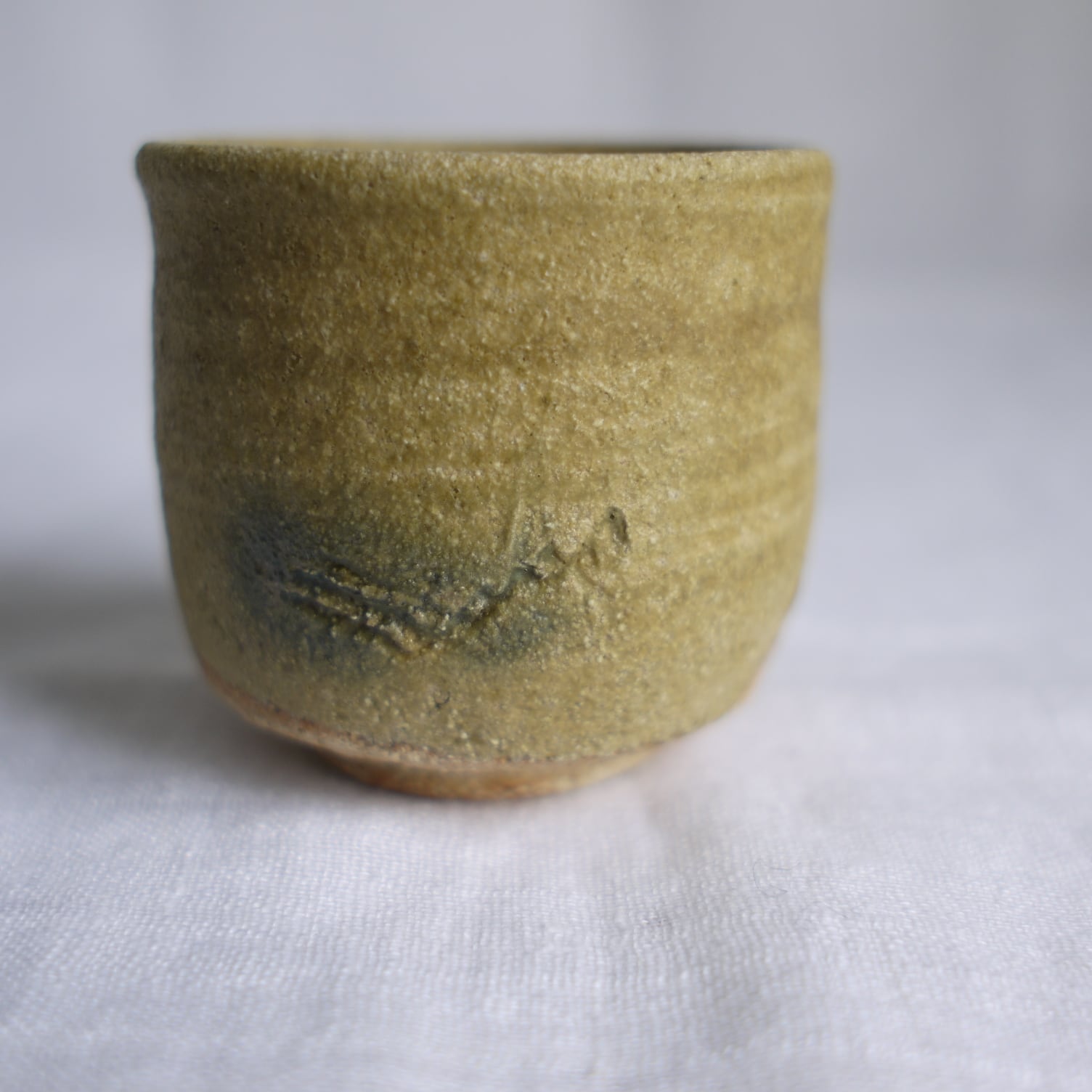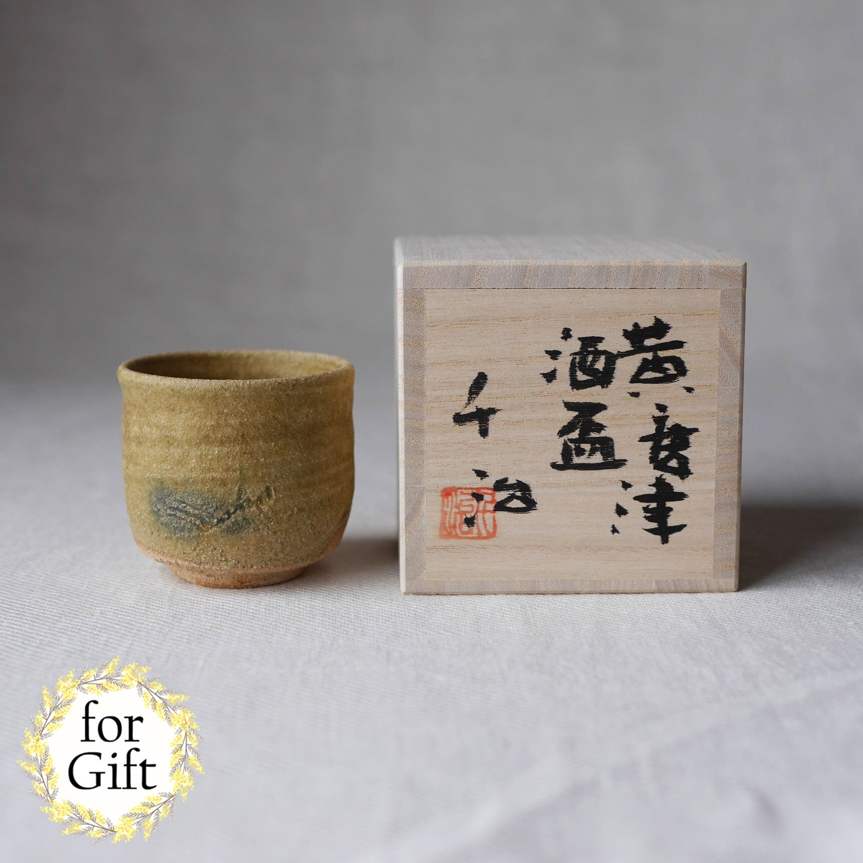 黄唐津と呼ばれる、少し珍しいタイプの唐津焼の酒盃。少しざらつきのある黄色の釉薬を使い、正面には線模様と緑釉をあしらいました