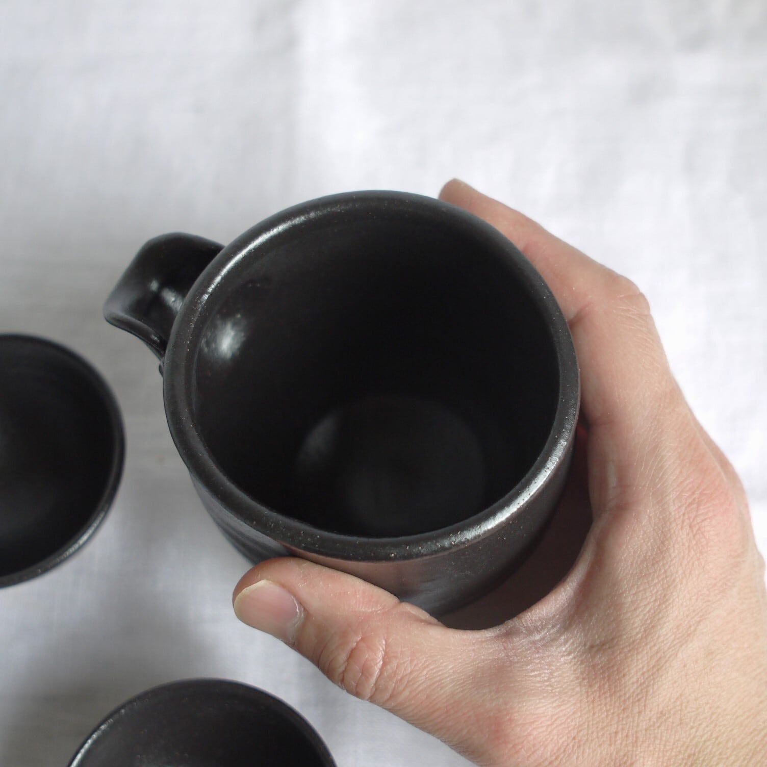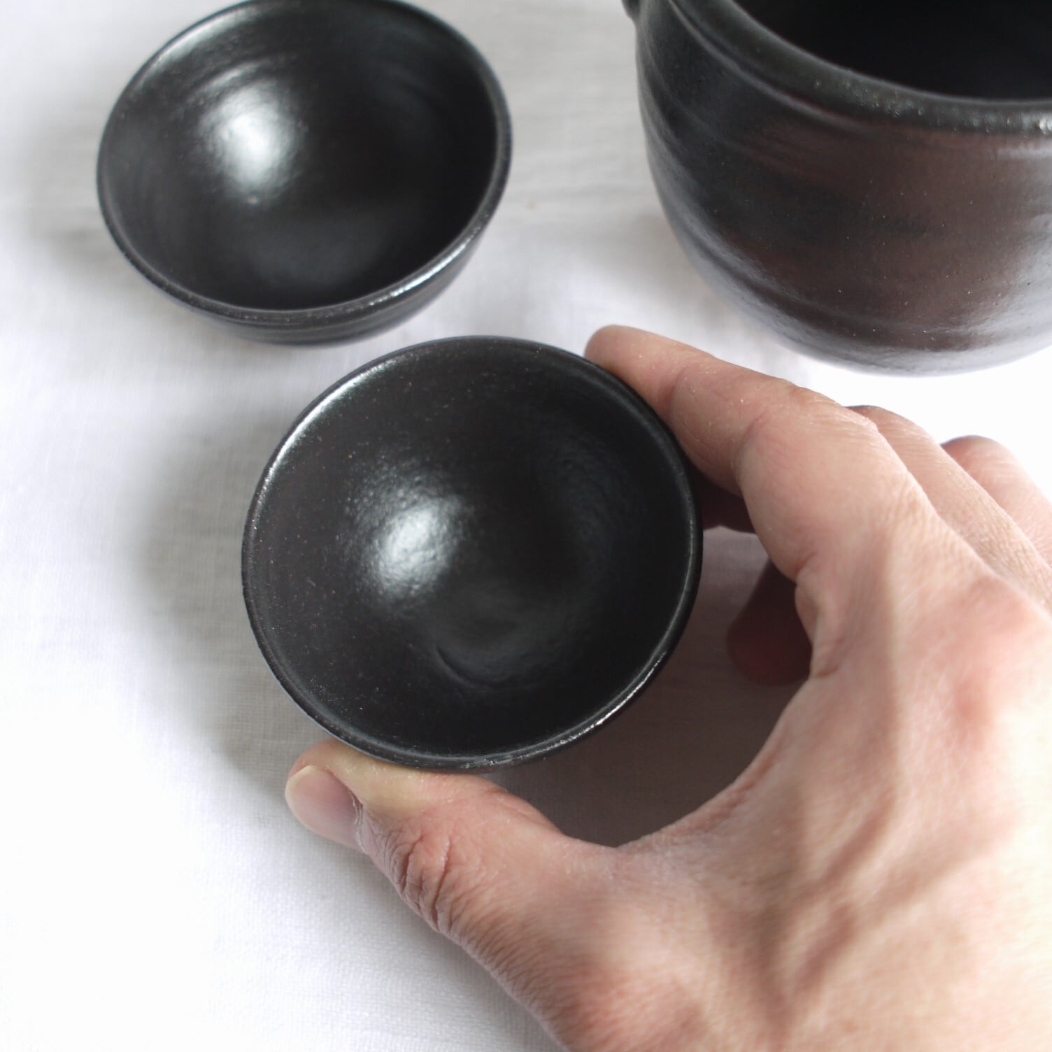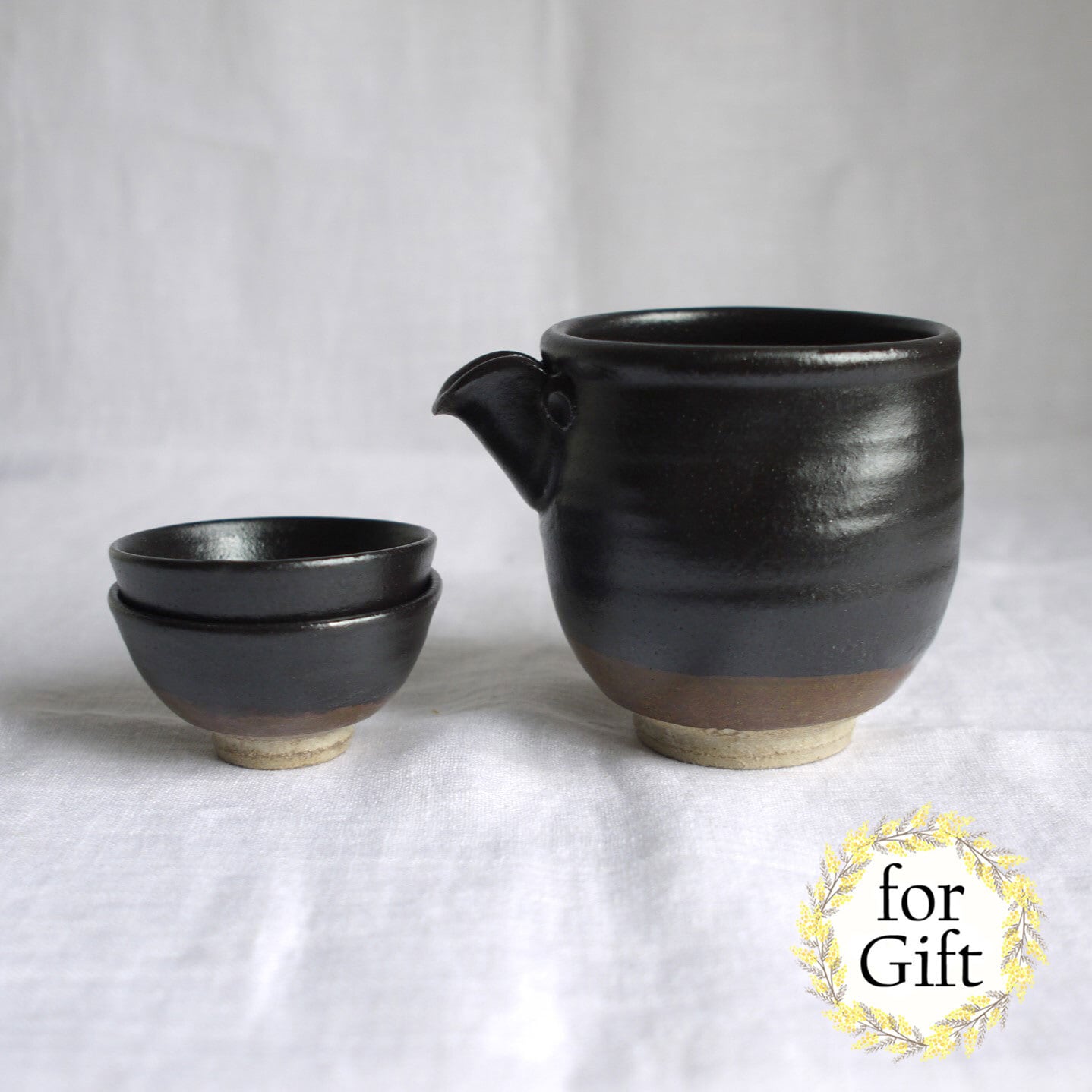 唐津焼の伝統的な釉薬“黒唐津”の酒器セット。