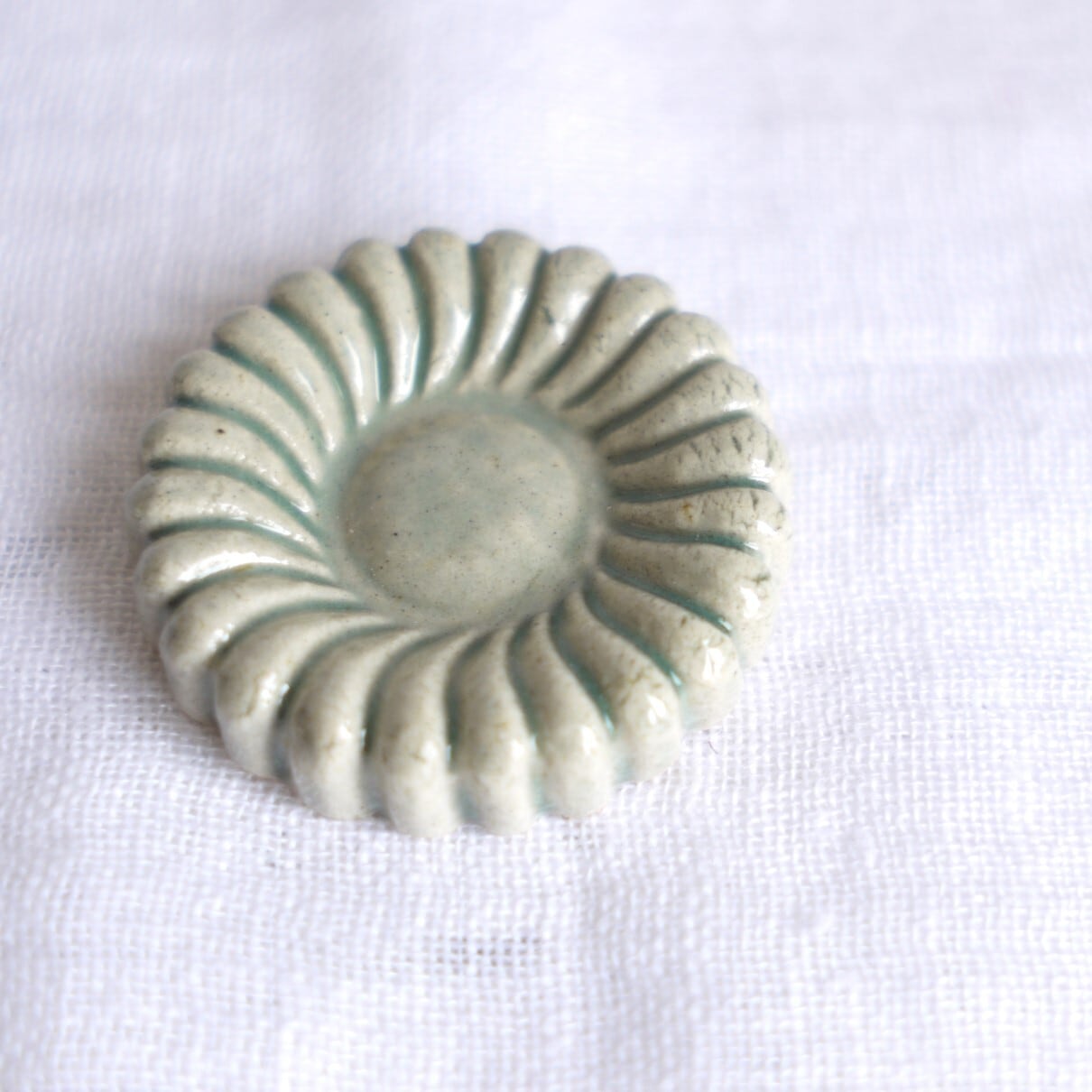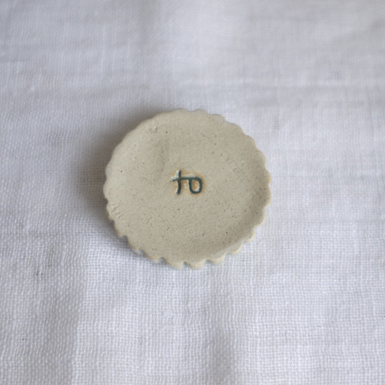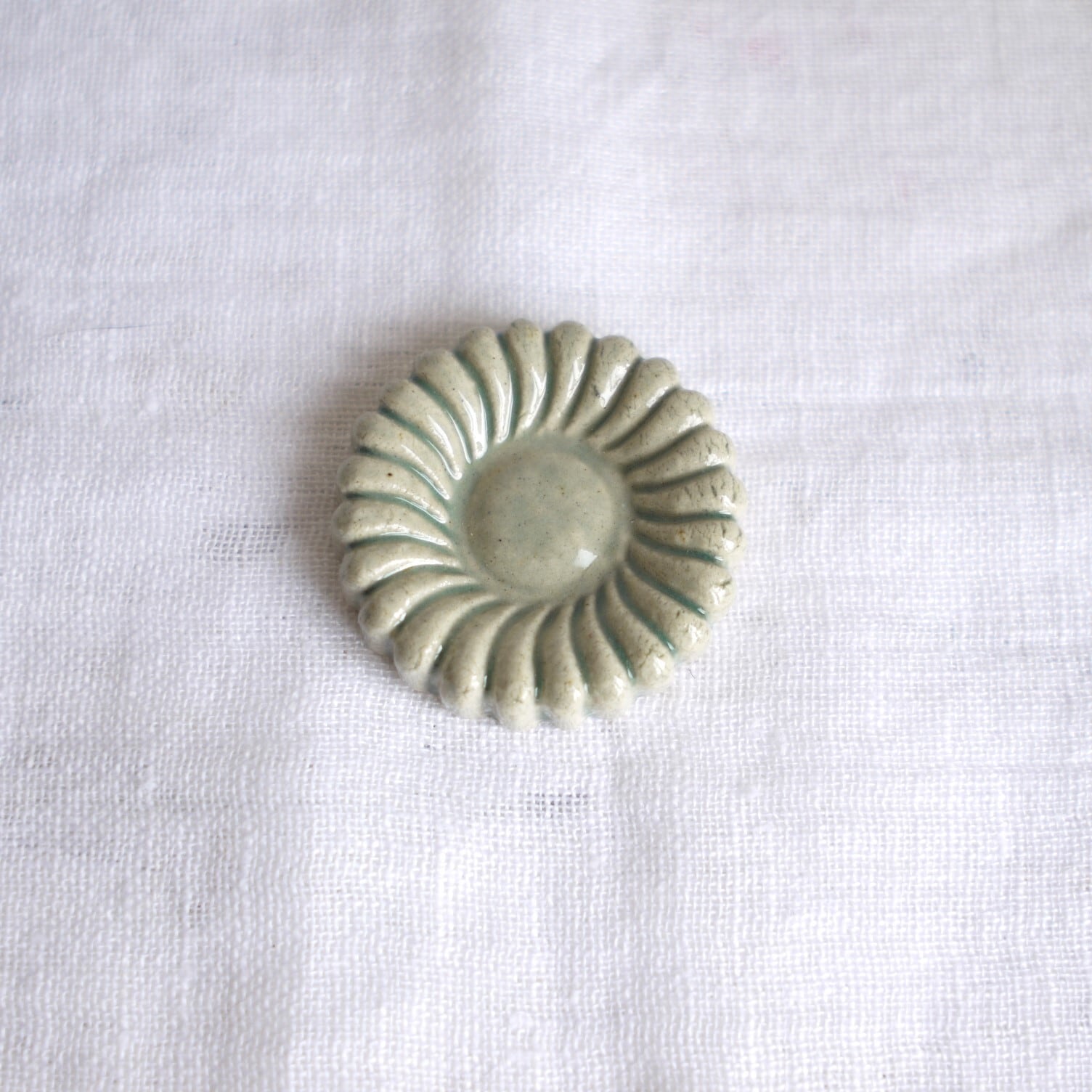 唐津の白い陶土で制作した、花形のお箸置き。水色の釉薬で仕上げました