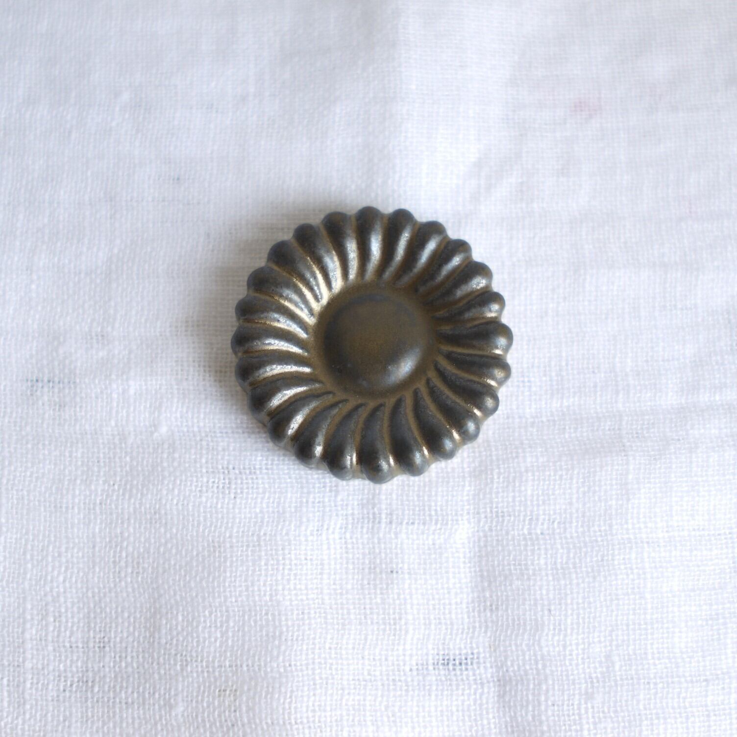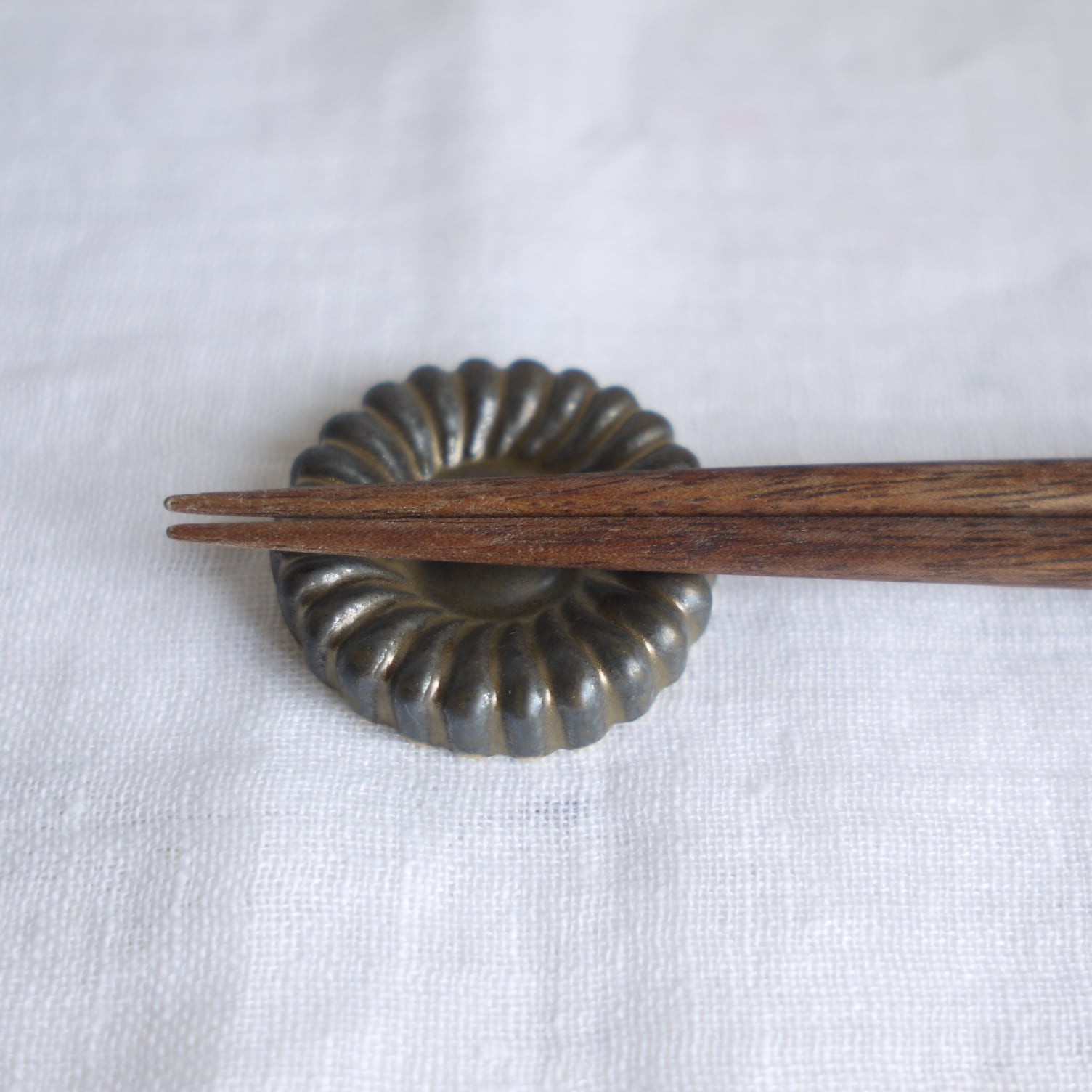 唐津の白い陶土で制作した、花形のお箸置き。金属質な風合いの黒釉で仕上げました