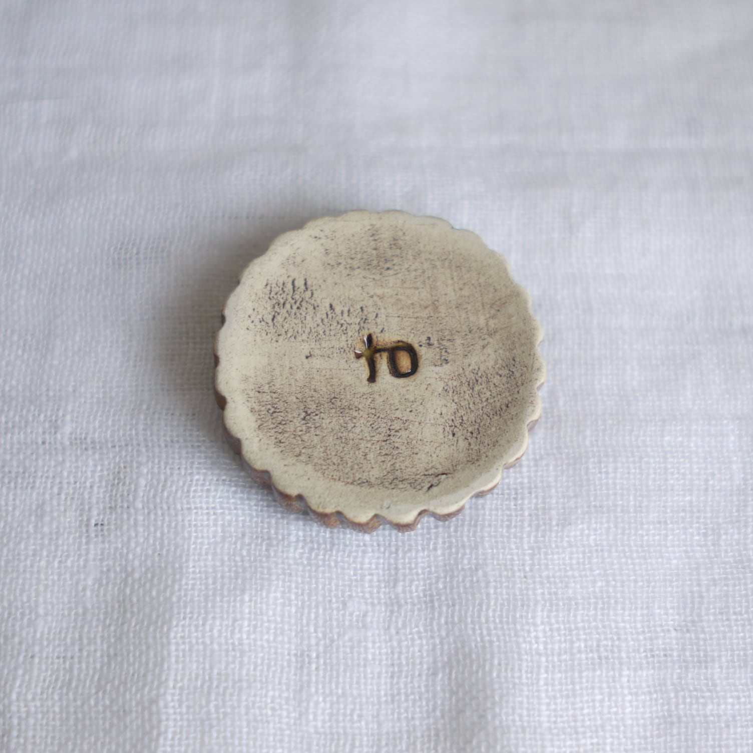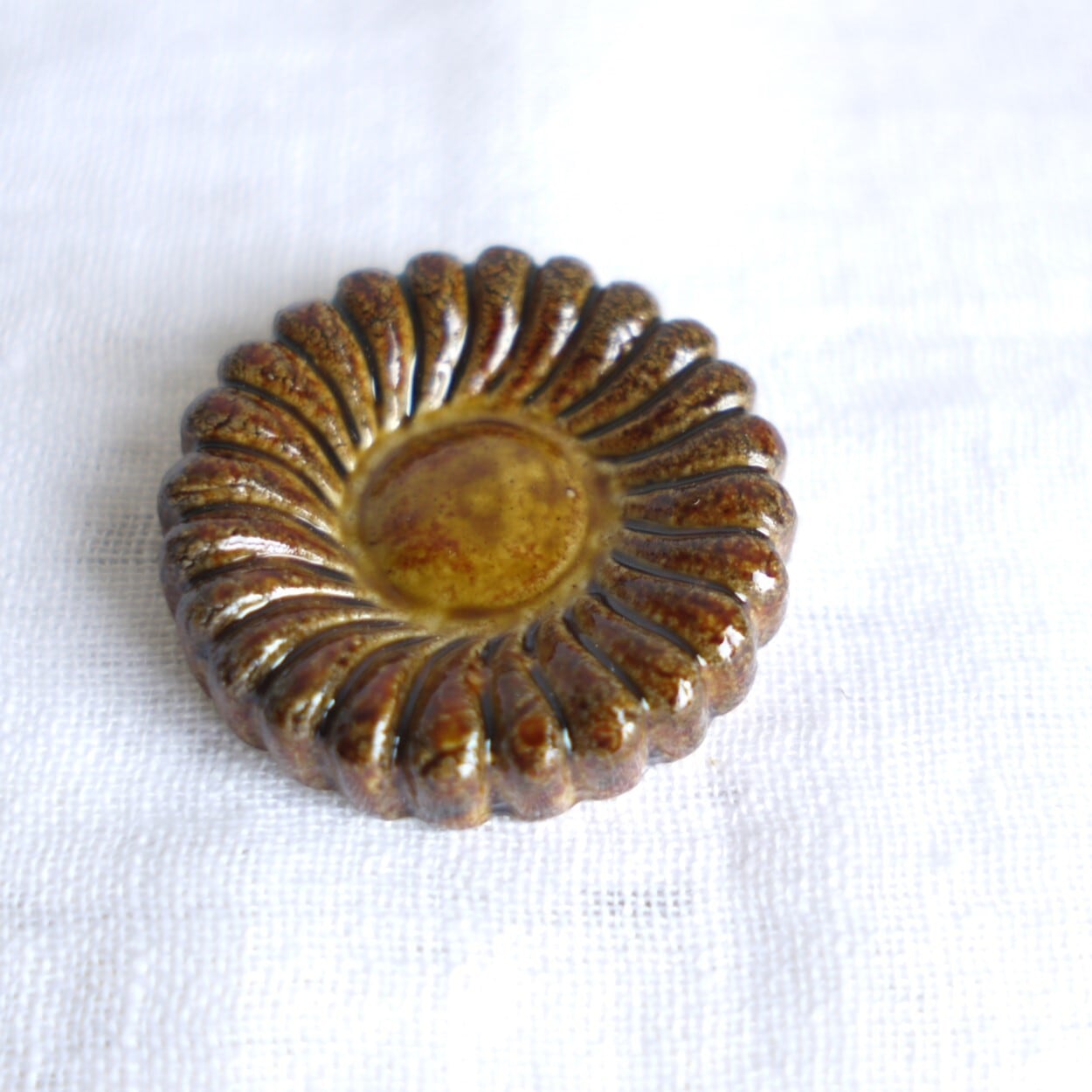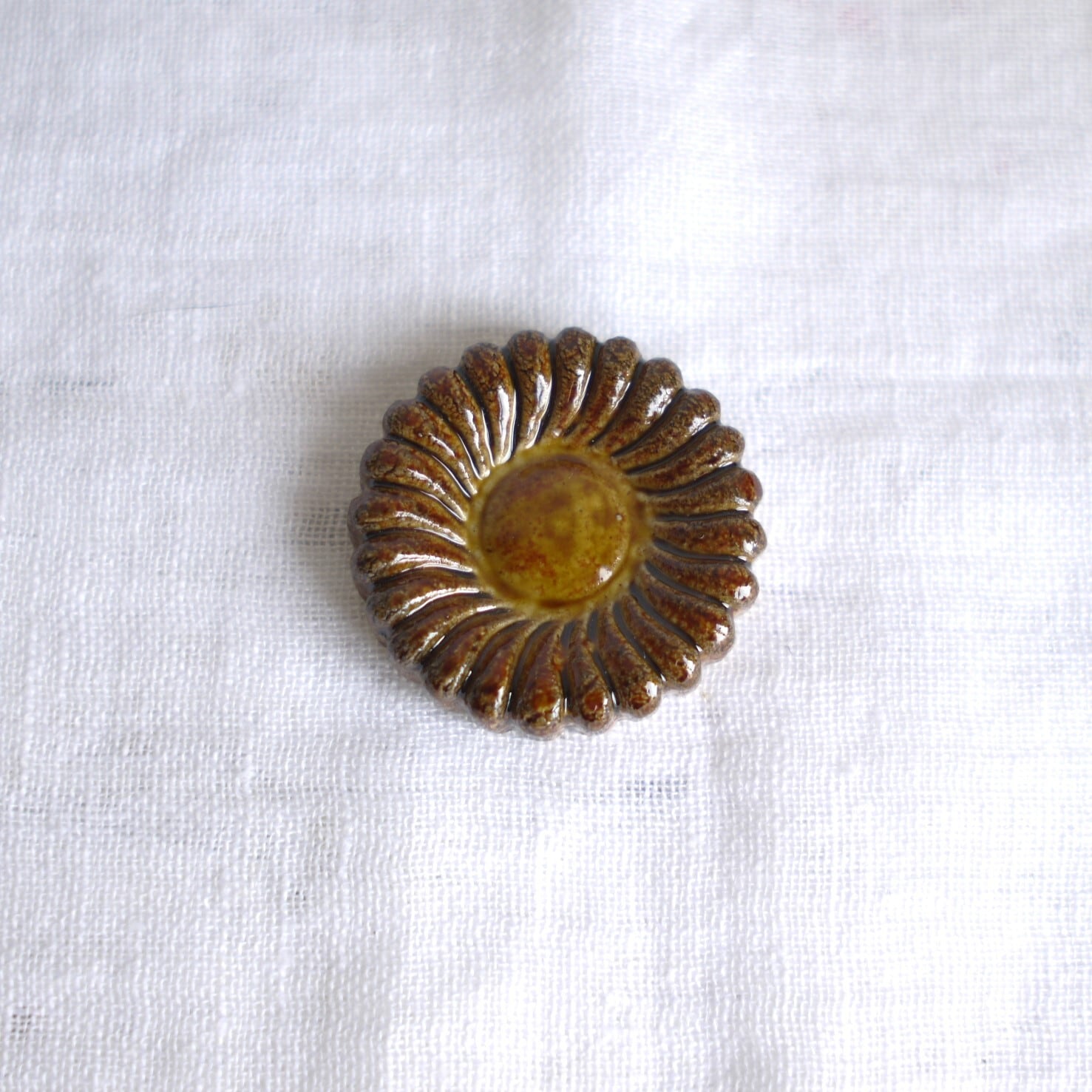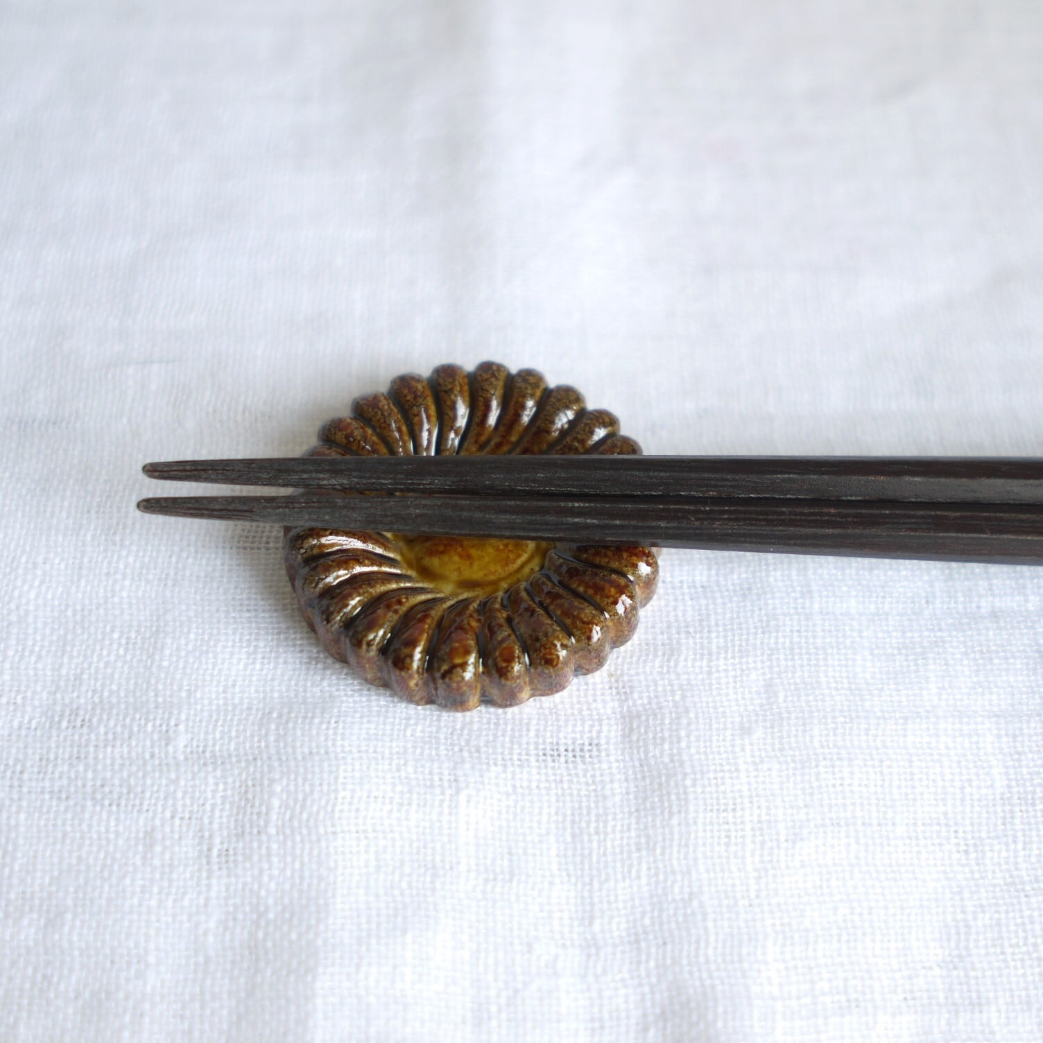 唐津の白い陶土で制作した、花形のお箸置き。伝統的な茶色の釉薬“飴釉”で仕上げました
