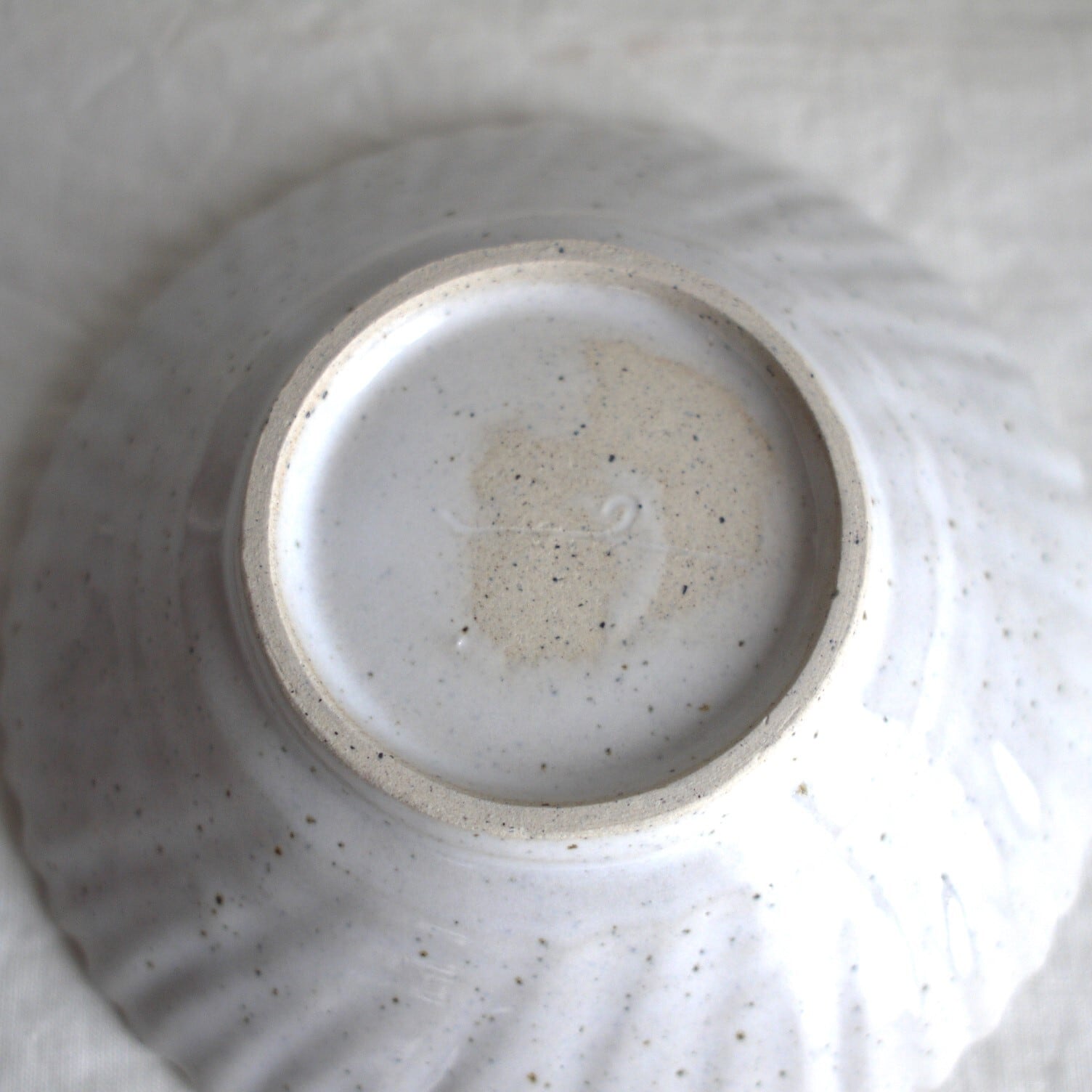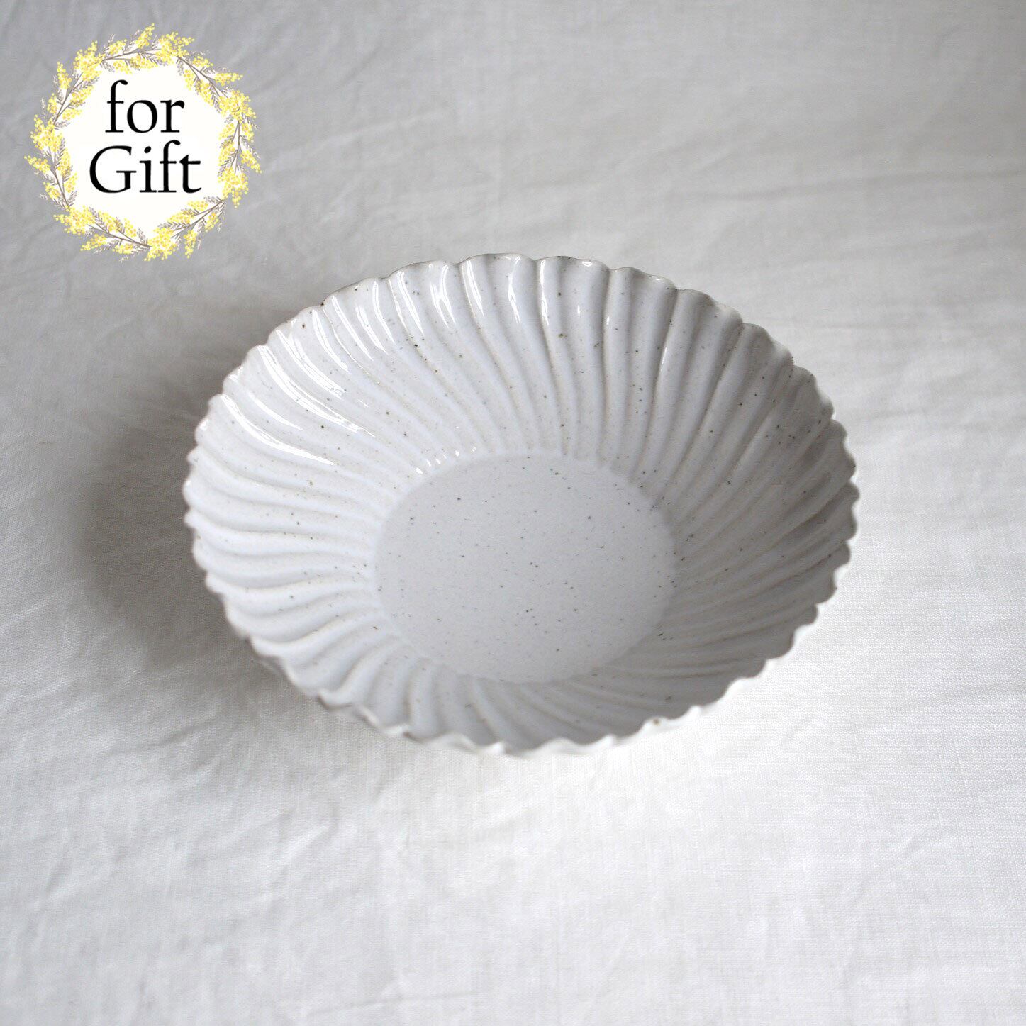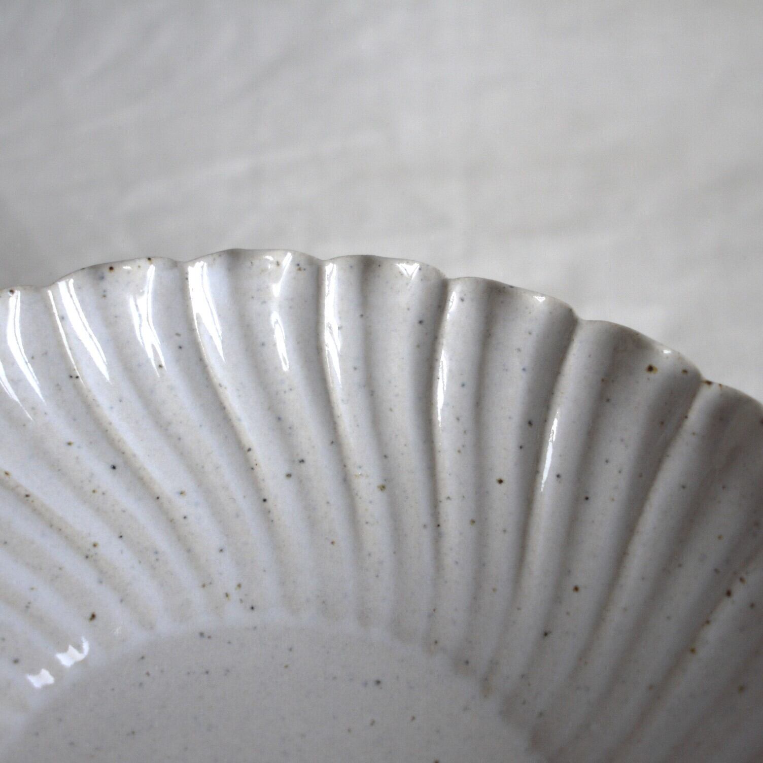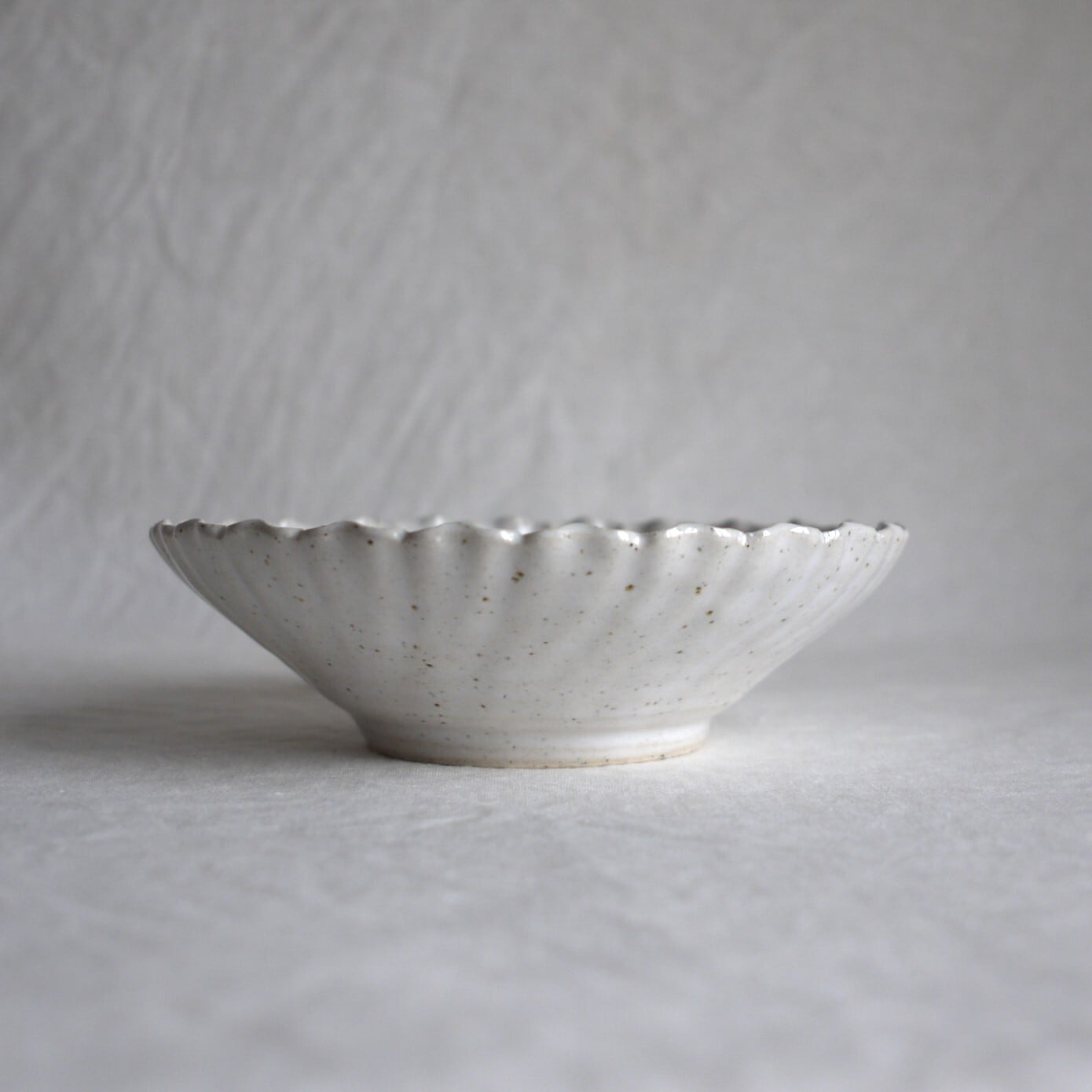 【唐津の真っ白な陶土で成形。型を使い、曲線が優雅な花の形に仕上げた浅い鉢です。お料理を盛り付け、銘々皿として。少ない量の副菜の盛り付け鉢としても。】